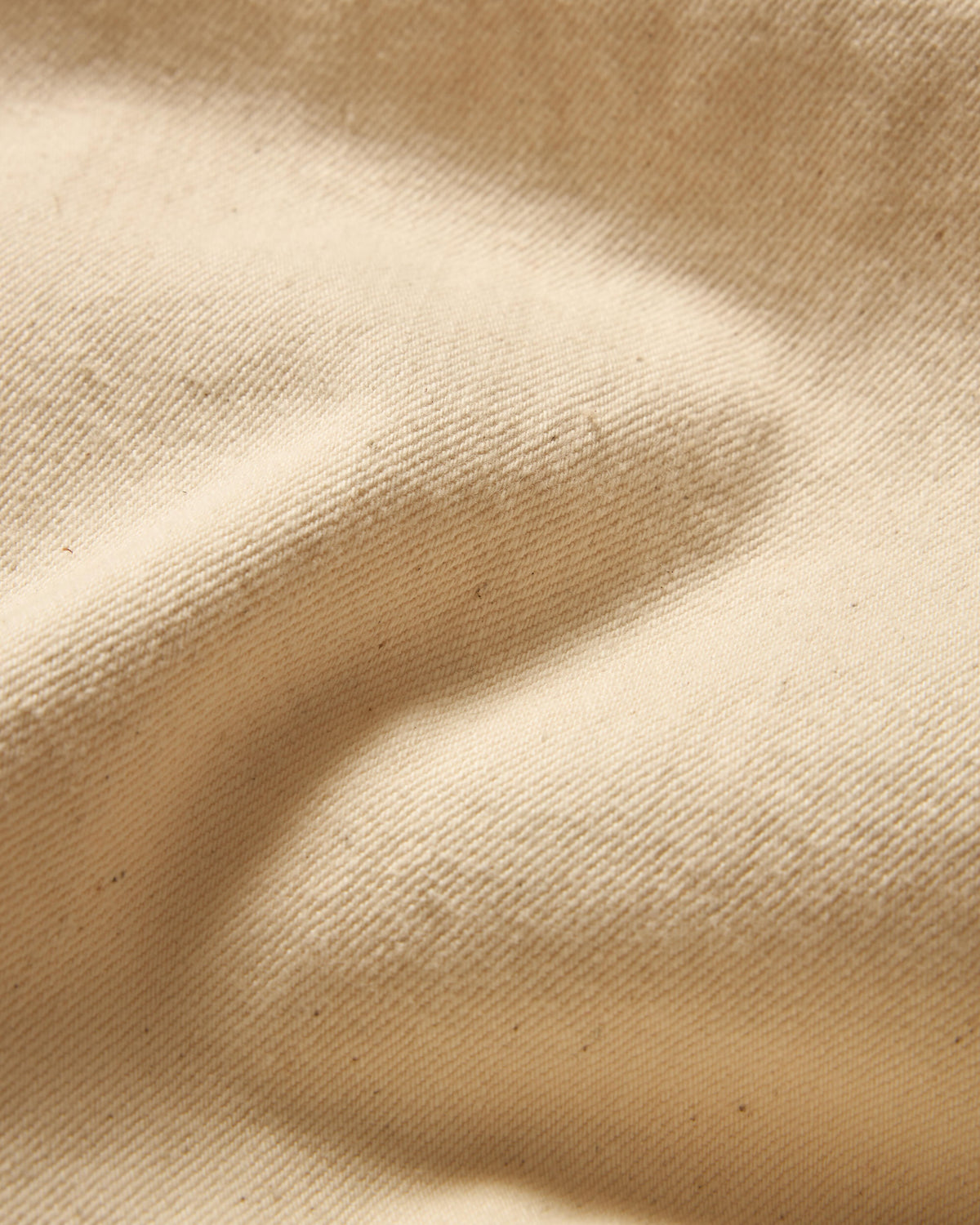 生地をよく見ると、表面やツイルの織りの中に小さな茶色の粒が点在しているのが分かります。これはコットンの殻の自然な残留物であり、漂白や過度な加工を行っていない証です。素材の持つ“ありのまま”を映し出しており、同じものは一つとして存在しません。